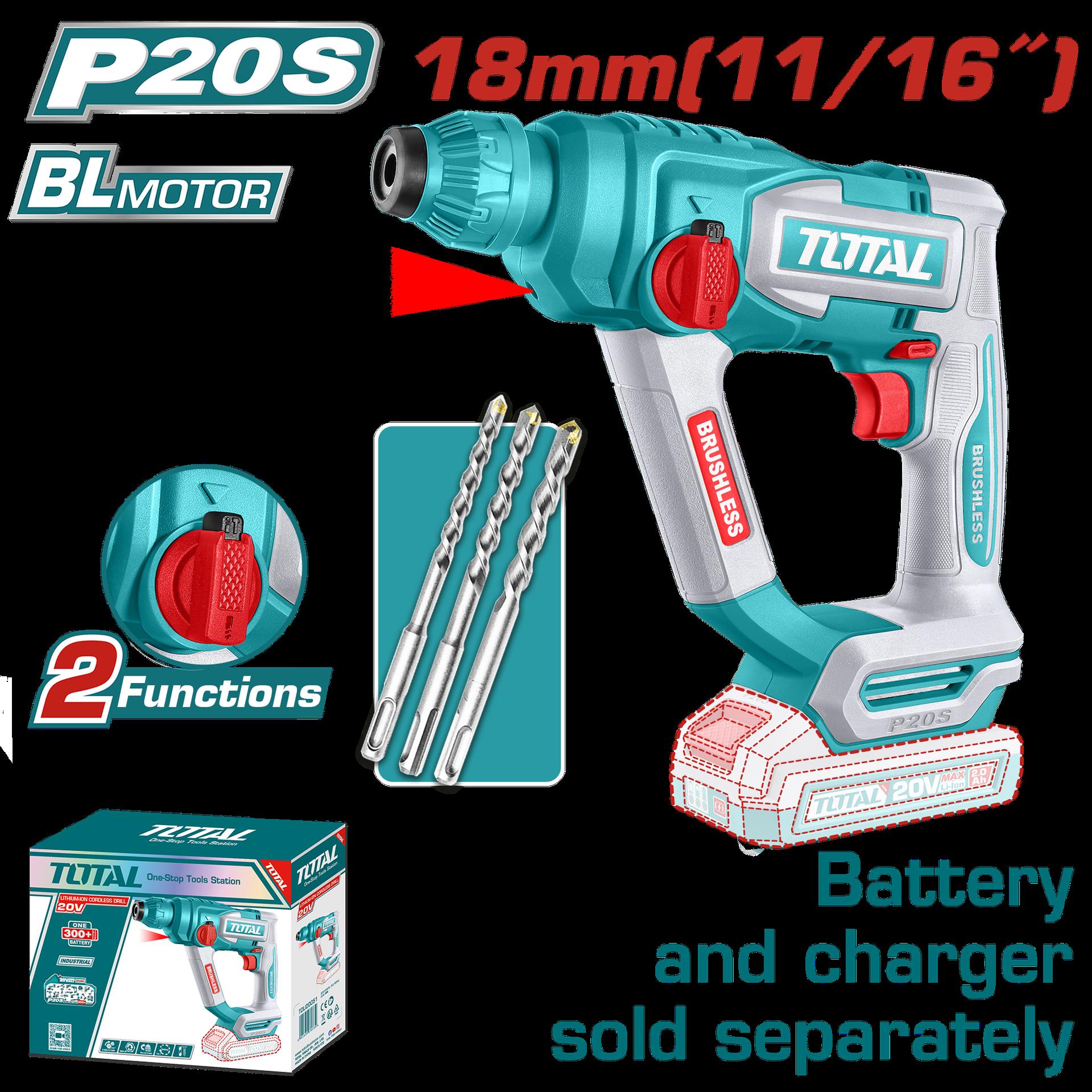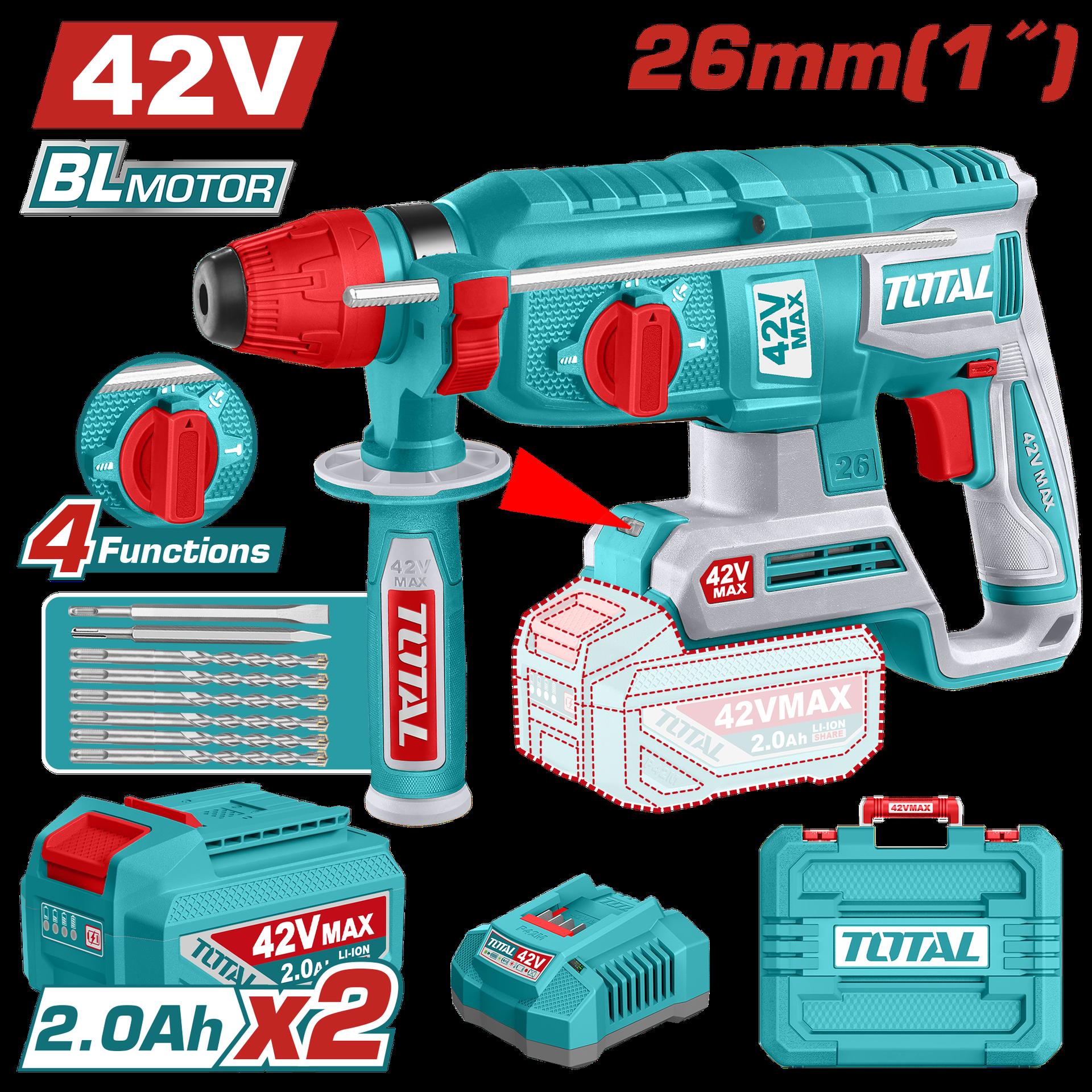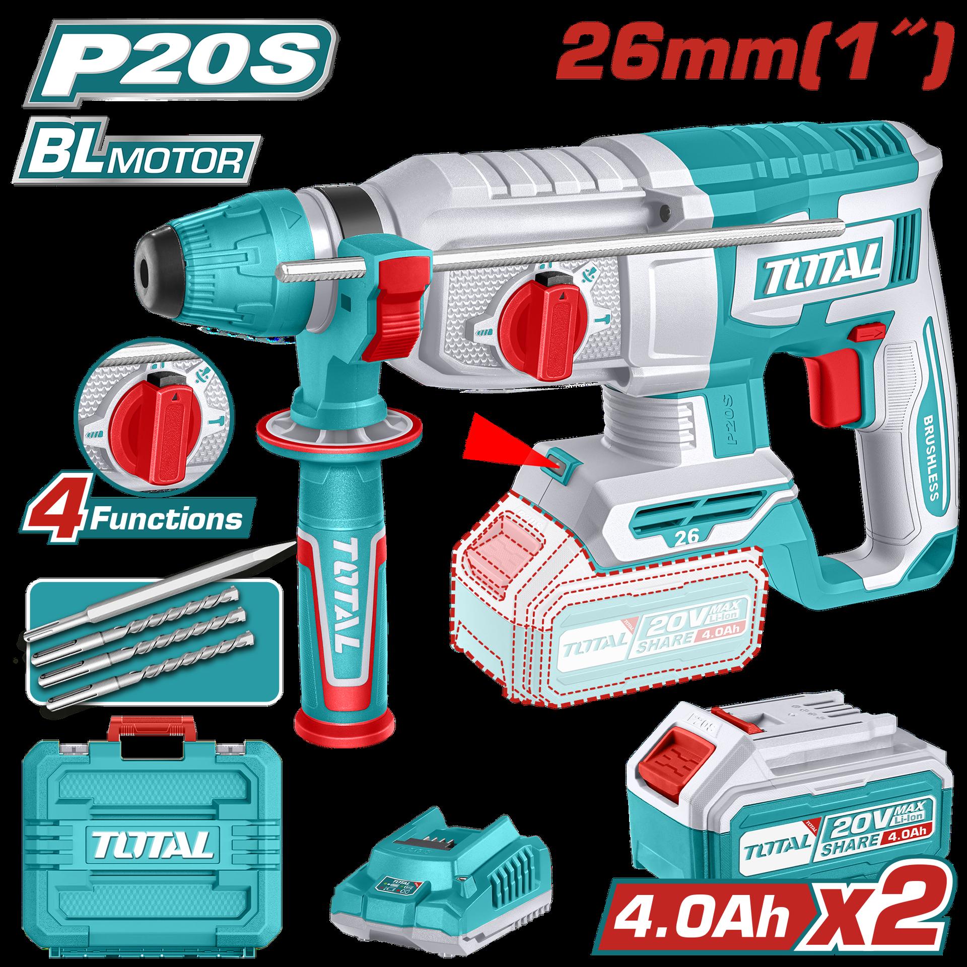TALADRO ROTOMARTILLO SDS PLUS 4.5 JULES INCLYE ACCESORIOS CARGADOR Y BATERIA NO INCLUIDO INDUSTRIAL TOTAL (TRHLI20288)