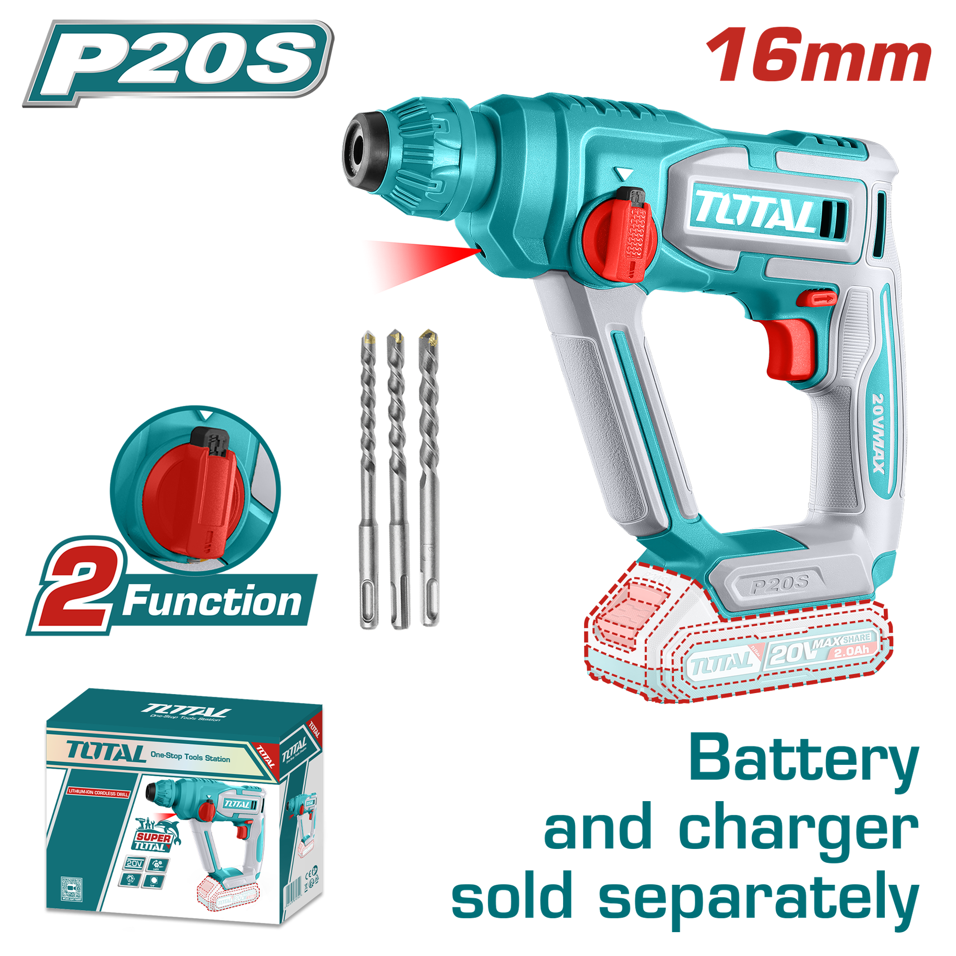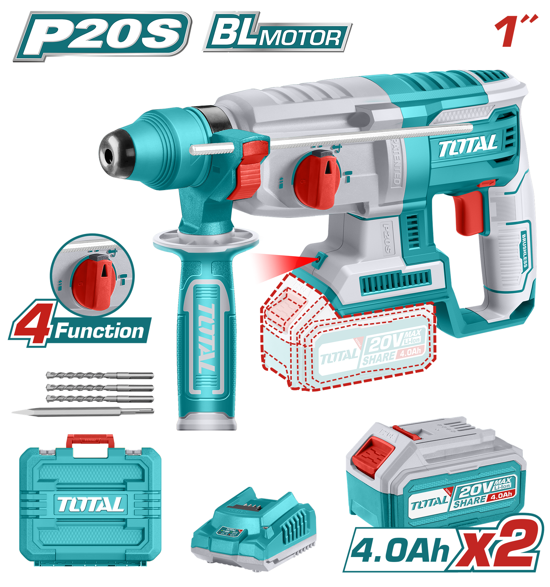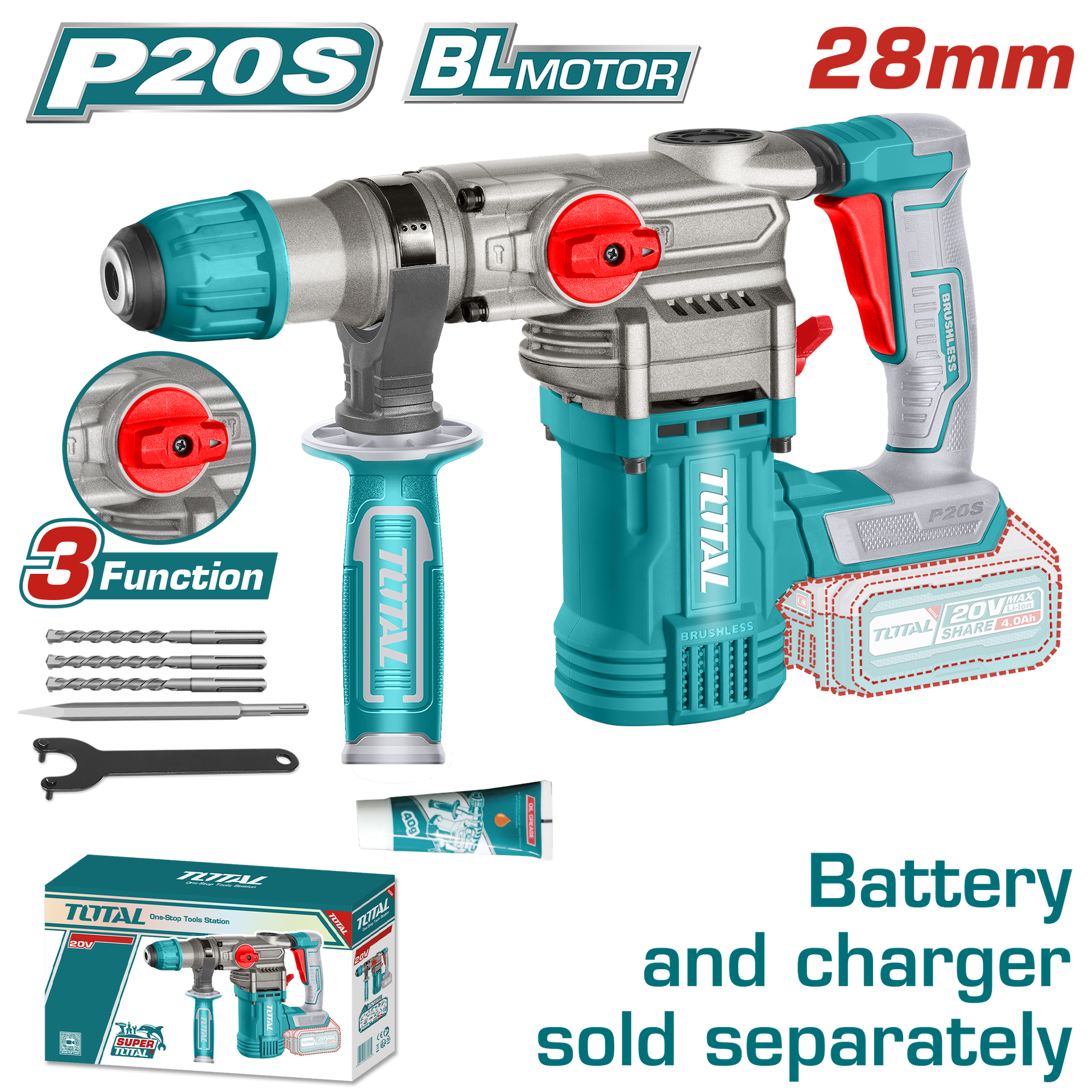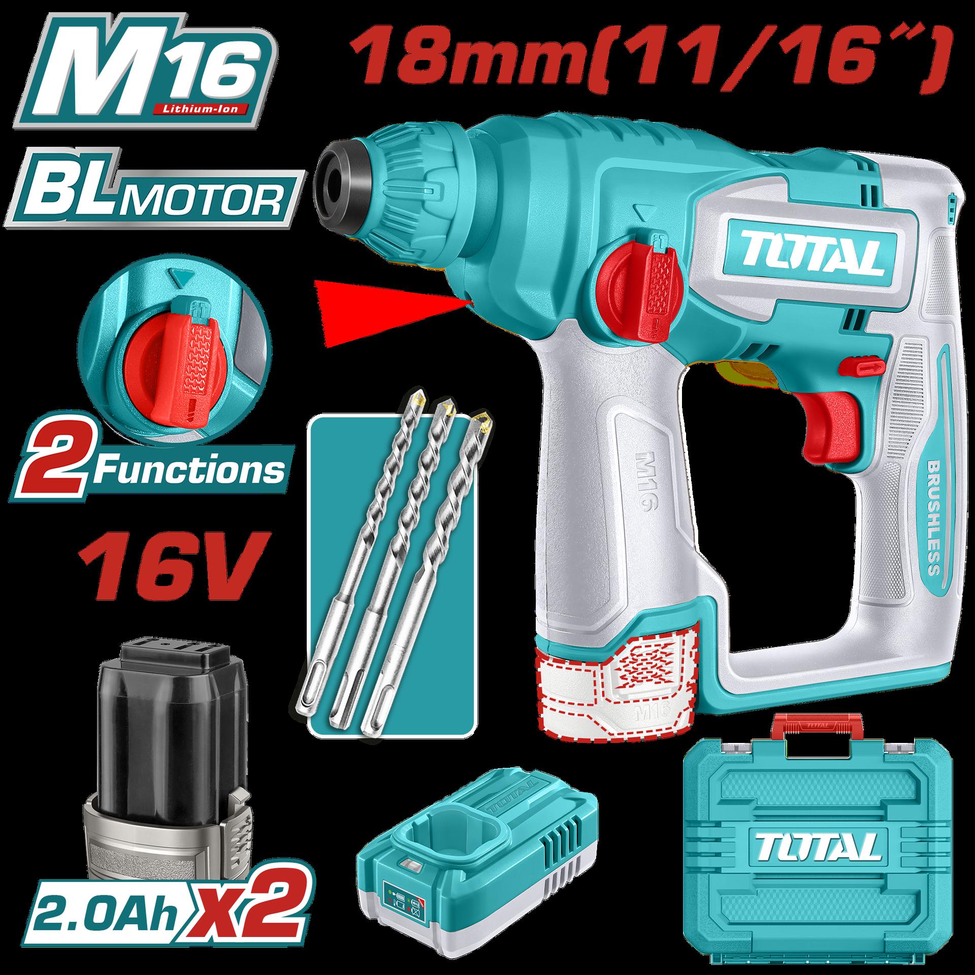 TALADRO ROTOMARTILLO SDS PLUS 4.5 JULES INCLYE ACCESORIOS CARGADOR Y BATERIA NO INCLUIDO INDUSTRIAL TOTAL (TRHLI20288)