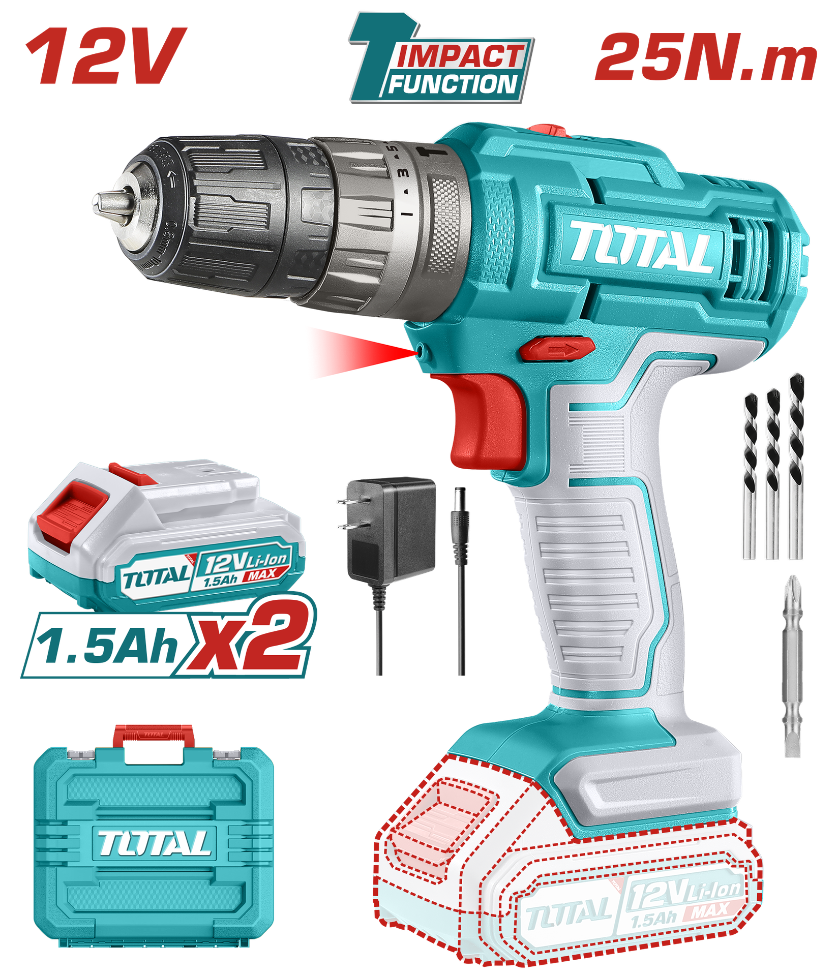 TALADRO DE IMPACTO INALAMBRICO 3/8" 12V INCLUYE 2 BATERIAS, 1 CARGADOR, 3 BROCAS Y 1 PUNTA TALADRO (+)(-) SUPER TOTAL (UTIDLI1228)