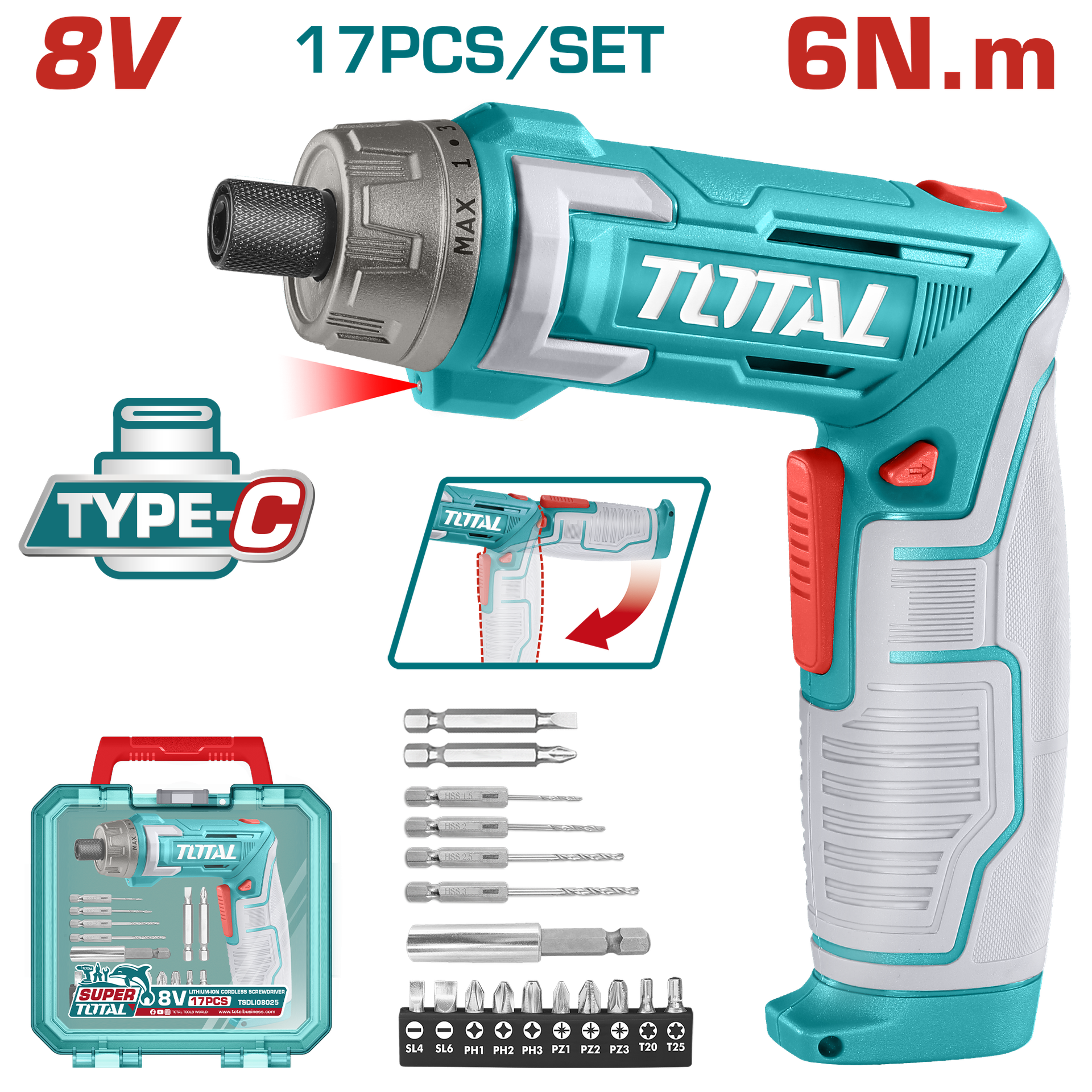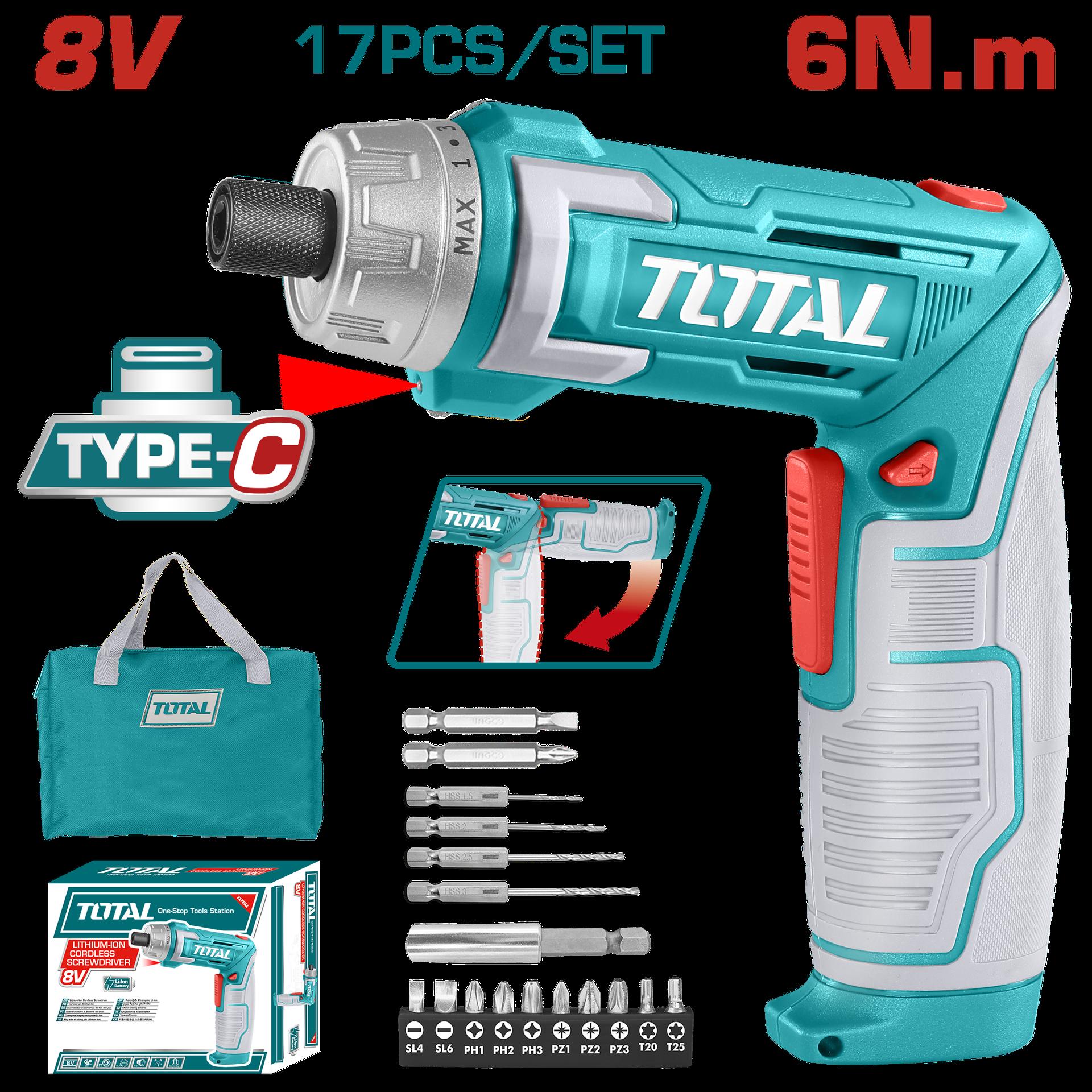 ATORNILLADOR INALAMBRICO 8V ESTUCHE PLASTICO + 17 PIEZAS TOTAL (TSDLI0802)