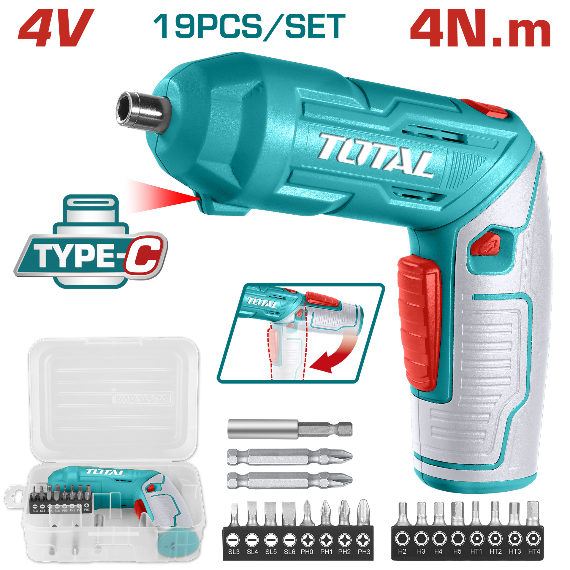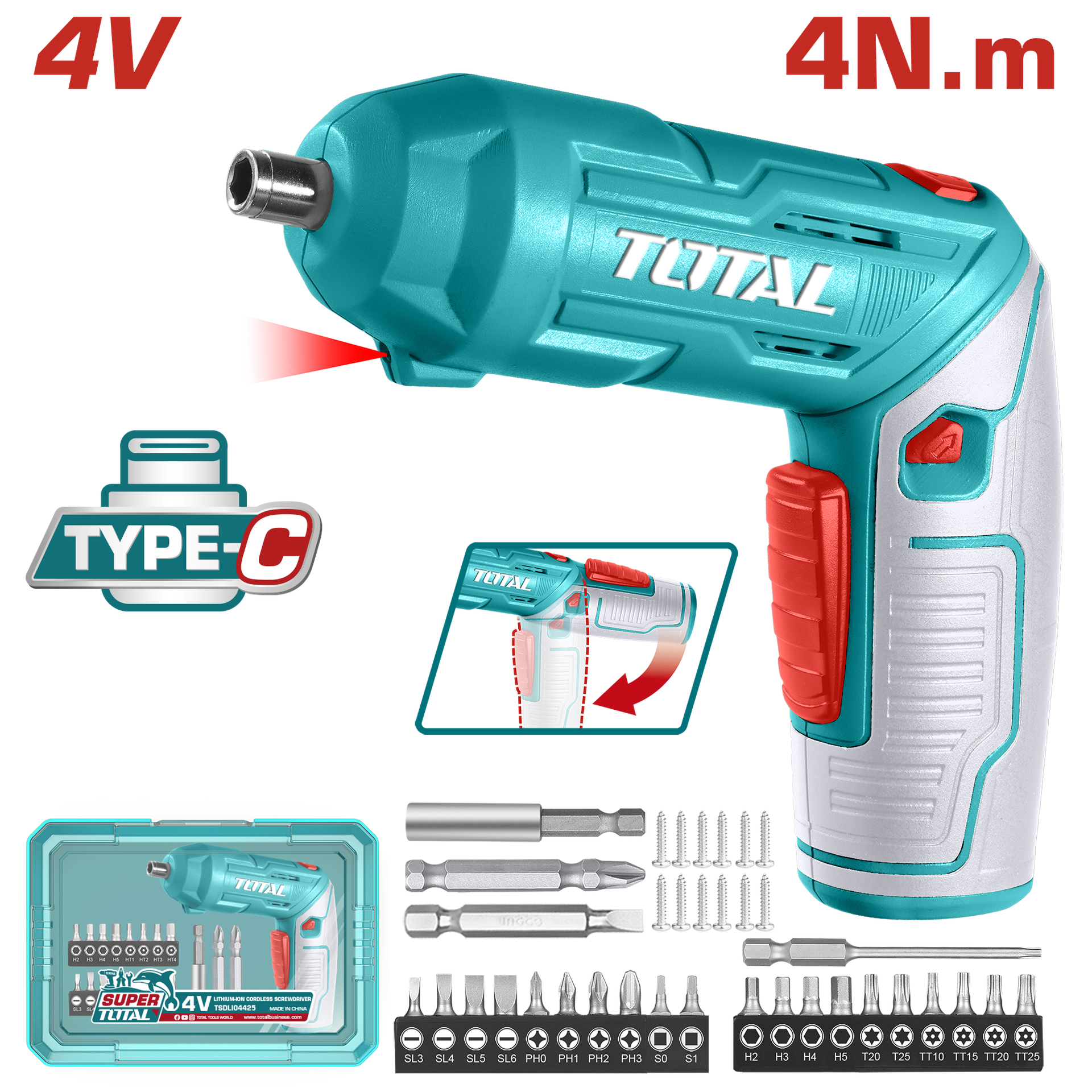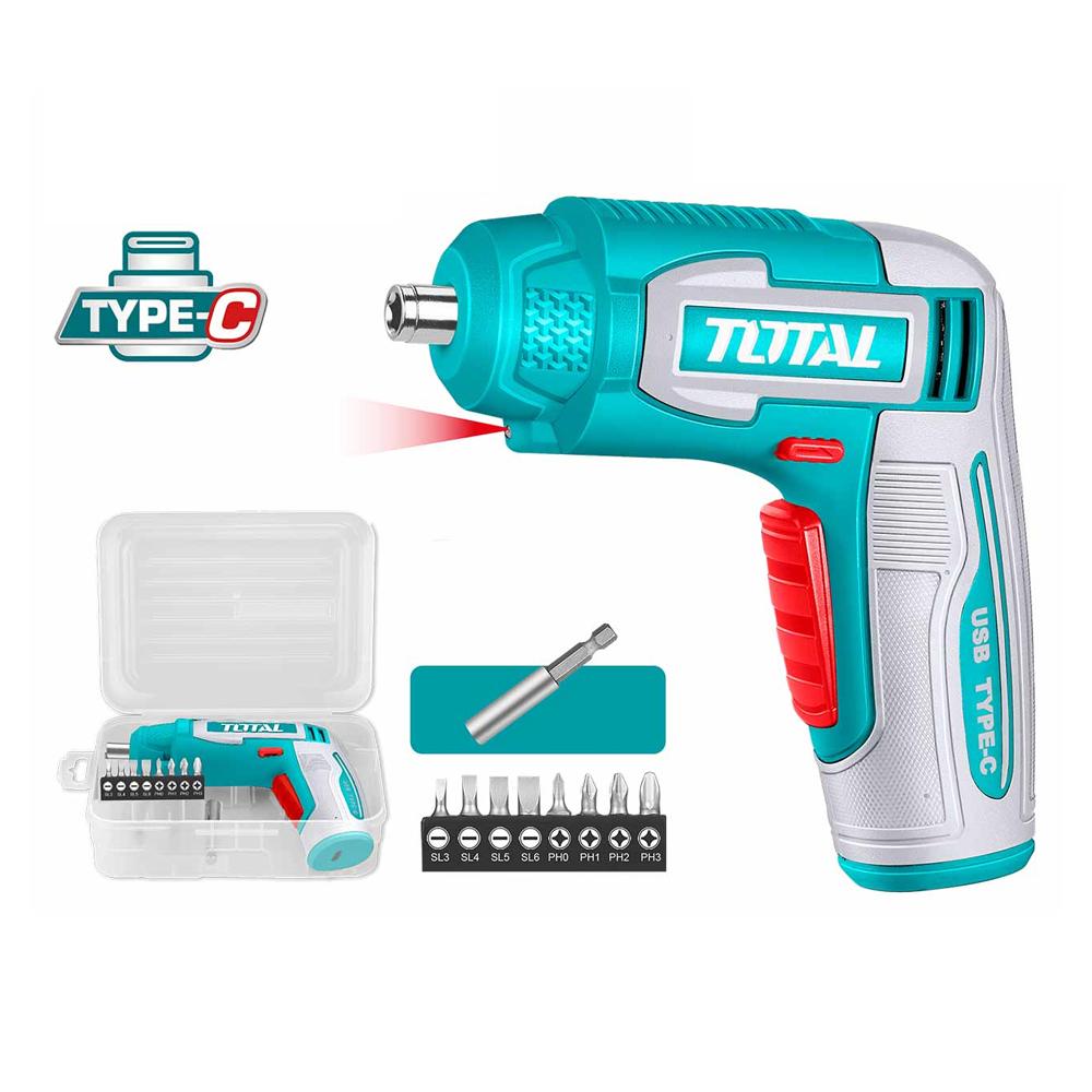 ATORNILLADOR INALAMBRICO 4V ESTUCHE PLASTICO + 20 PUNTAS TALADRO DE 25MM, 2 DE 50MM, 1 BROCA Y CONECTOR SUPER TOTAL (TSDLI04425)