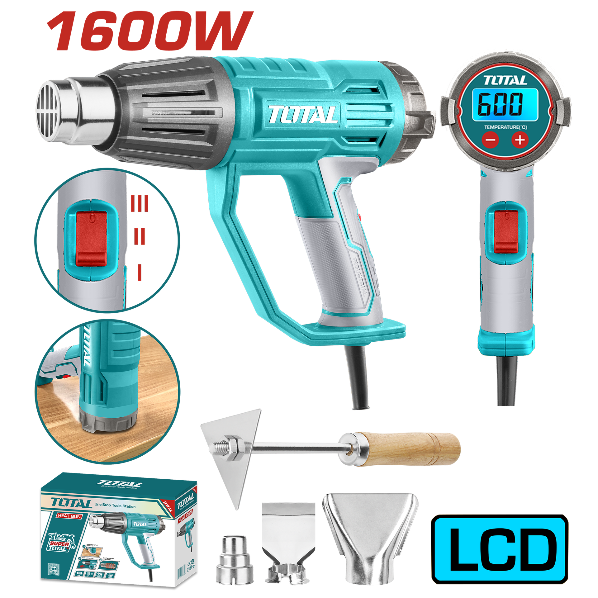 PISTOLA CALOR CON TEMPERATURA AJUSTABLE PANTALLA LCD 1600W INCLUYE 3 BOQUILLAS Y 1 RASCADOR INDUSTRIAL TOTAL (UTB16056)