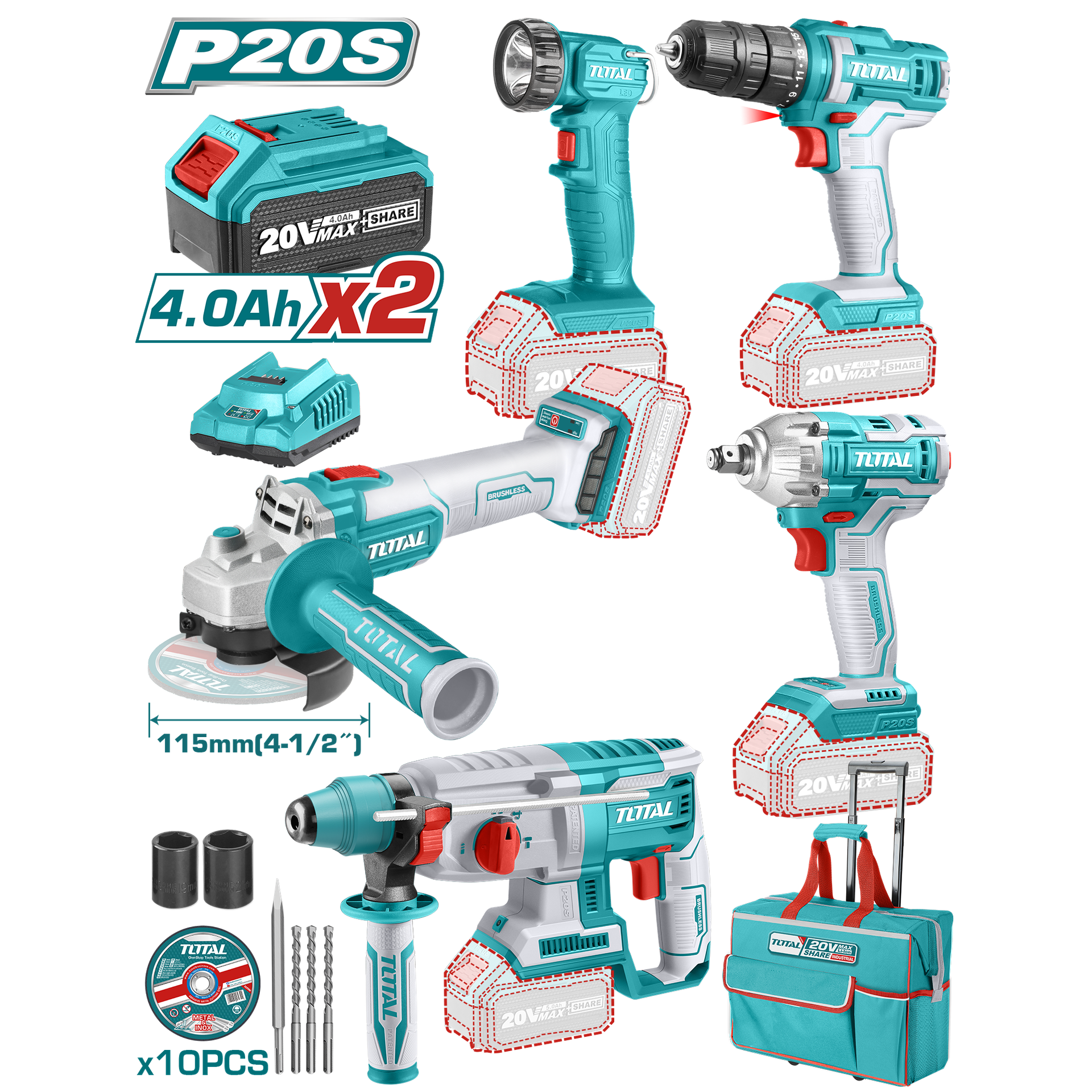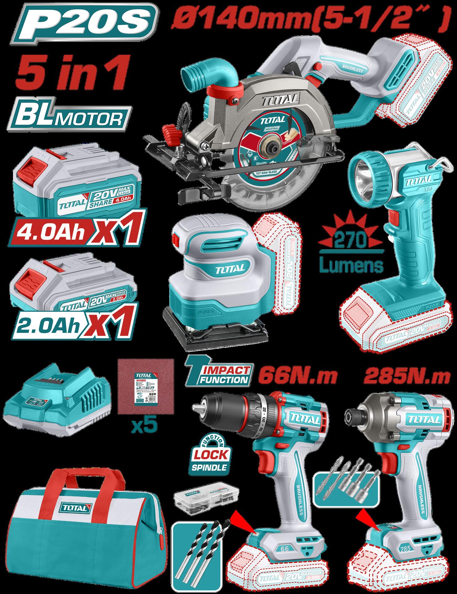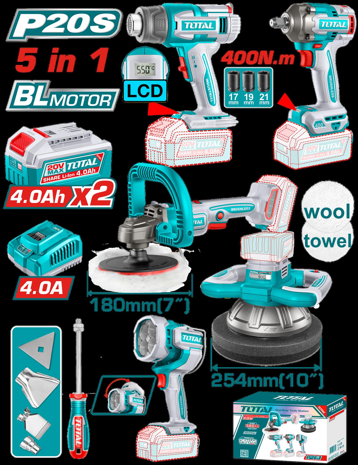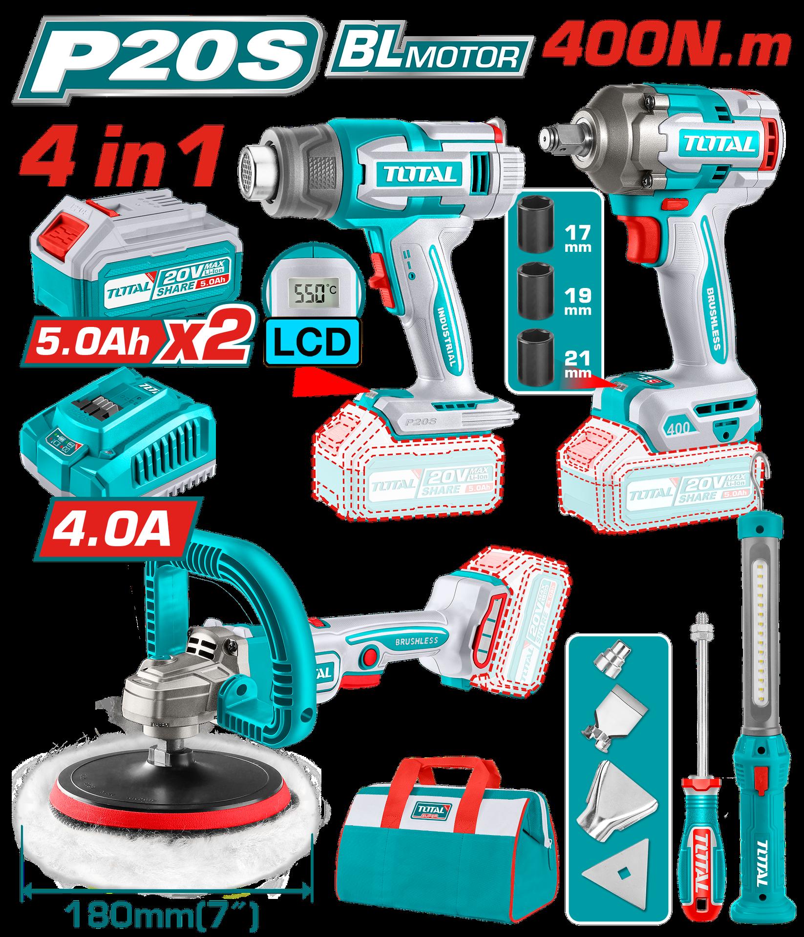 COMBO INALAMBRICO 20V POLICHADORA 7" + PISTOLA IMPACTO 1/2 400 N.M + PISTOLA DE CALOR + LAMPARA DE TRABAJO 300 LUMENES INCLUYE 2 BATERIAS 5.0AH, 1 CARGADOR Y ACCESORIOS INDUSTRIAL SUPER TOTAL (UTOSLI241182)