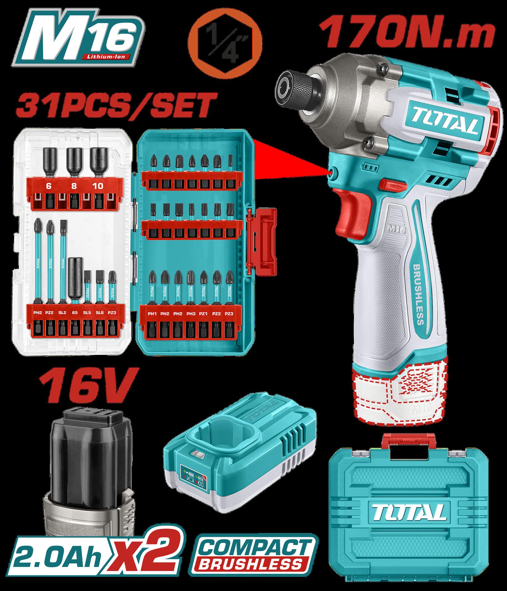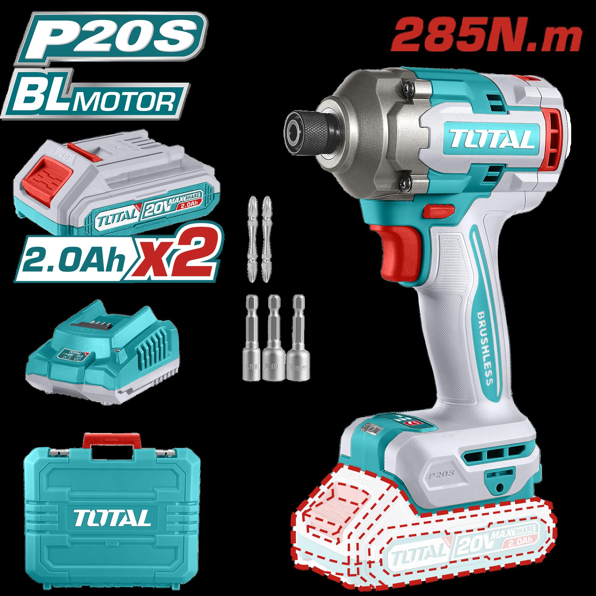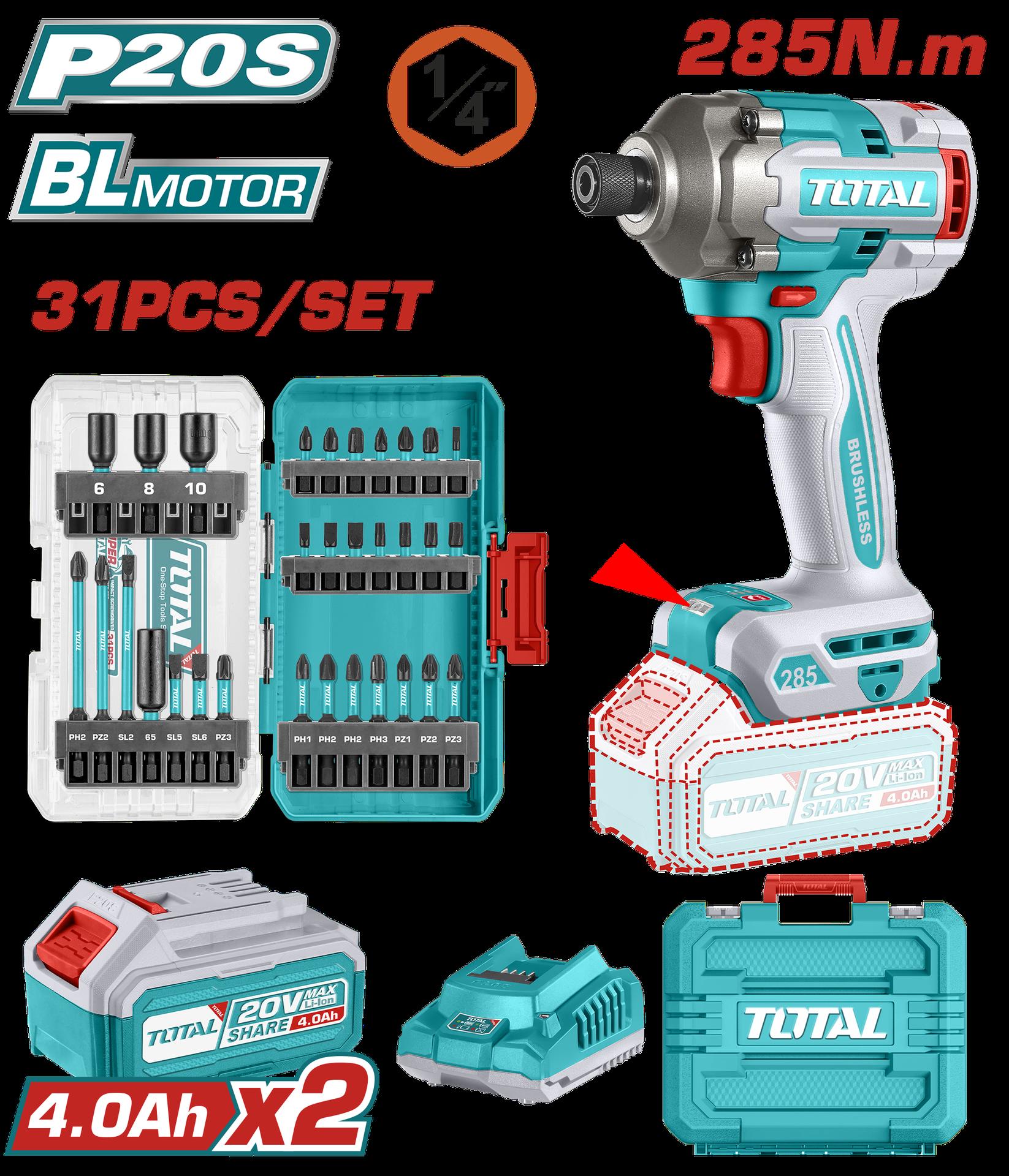 ATORNILLADOR DE IMPACTO INALAMBRICO 1/4 20V 285NM + JUEGO DE PUNTAS X 31 PZS INCLUYE 2 BATERIAS 4.0AH Y CARGADOR INDUSTRIAL SUPER TOTAL (UTOSLI240966)