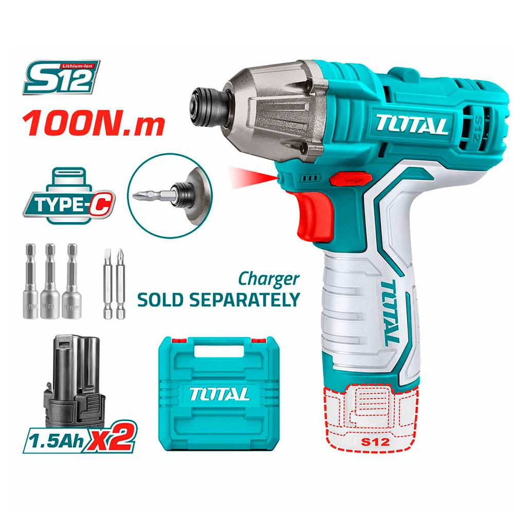 ATORNILLADOR DE IMPACTO INALAMBRICO 1/4 12V 100NM INCLUYE 2 BATERIAS, 2 PUNTA TALADRO Y 3 COPAS CAJA PLASTICA SUPER TOTAL (TIRLI12015)