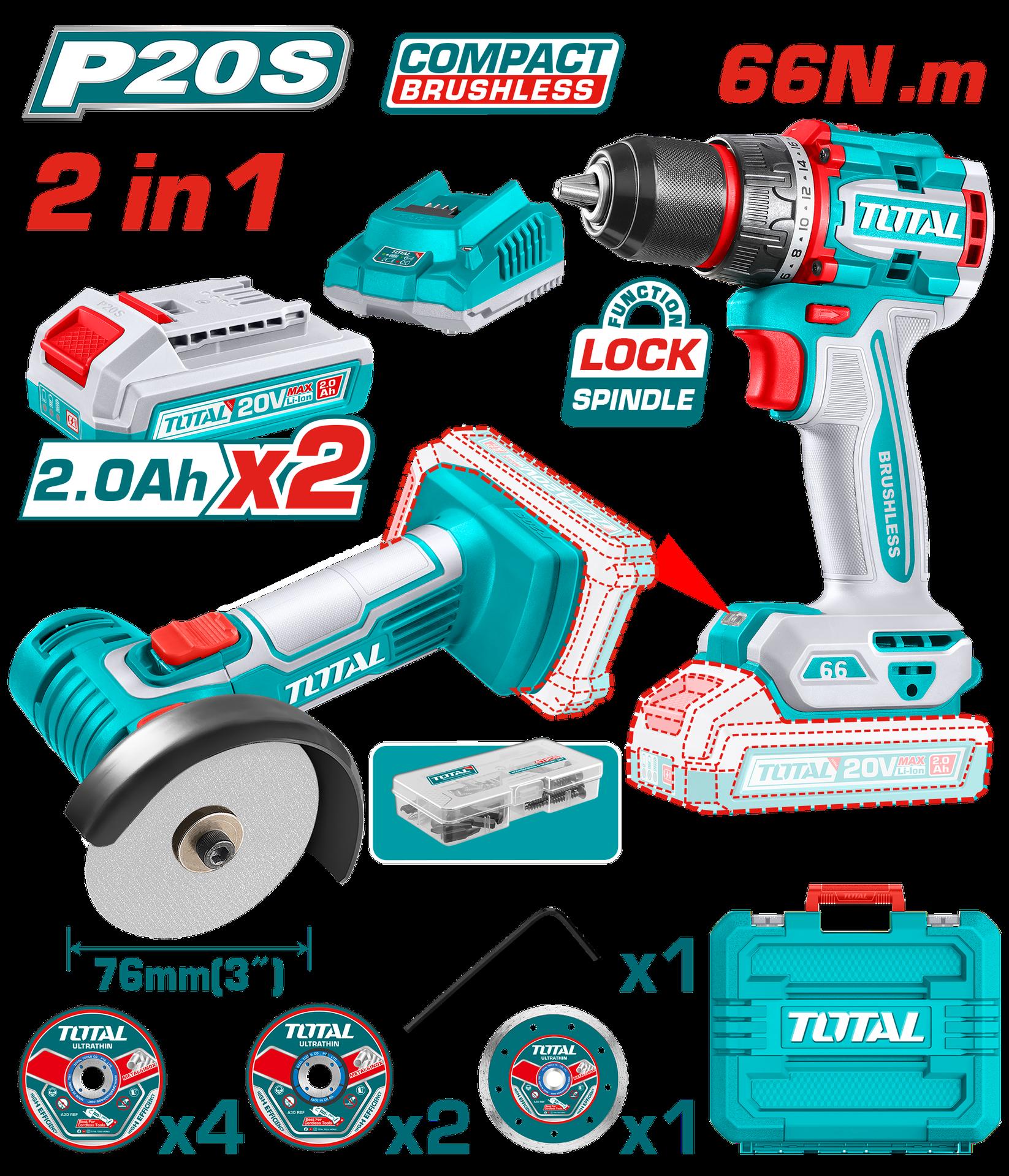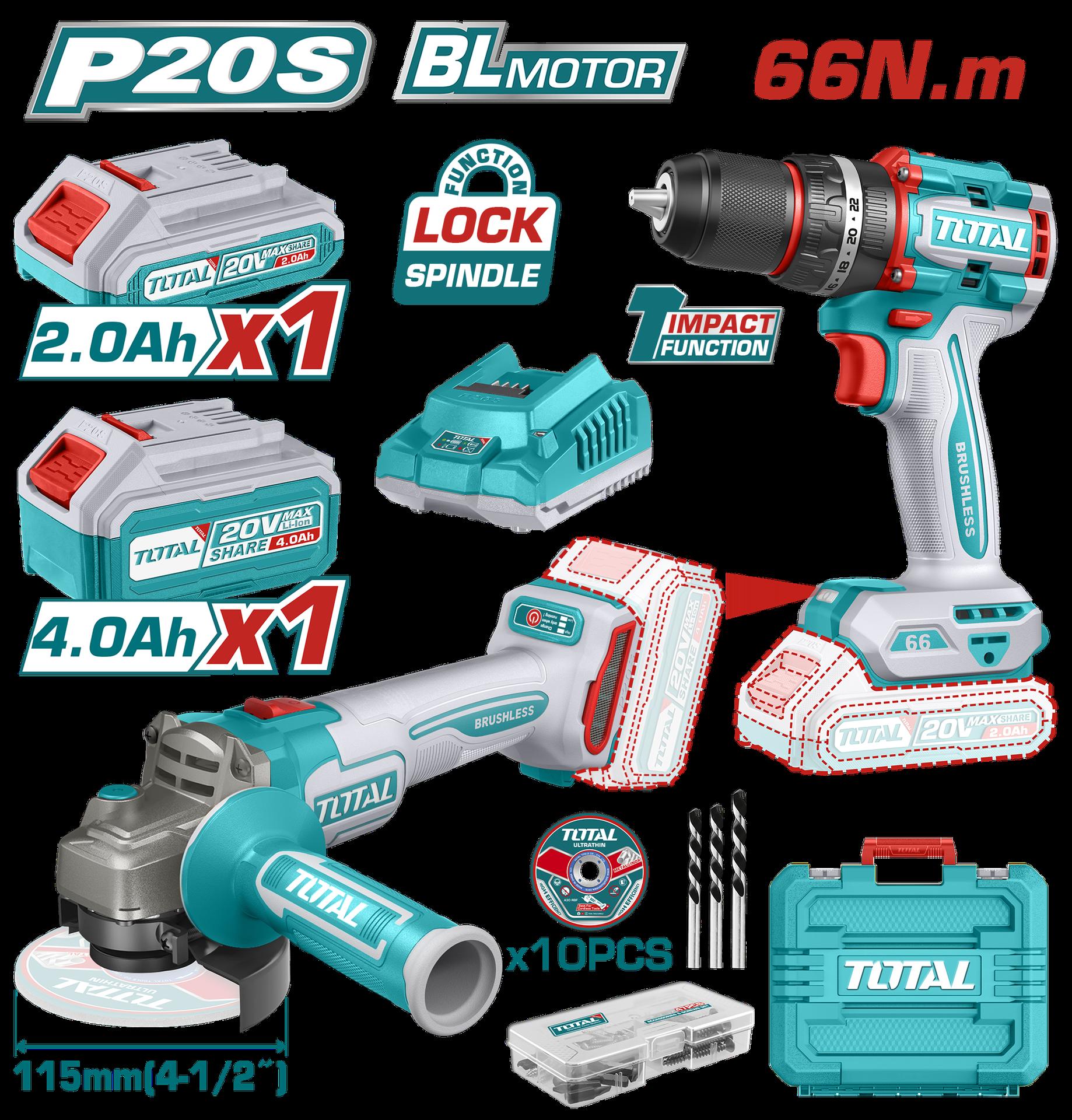 COMBO INALAMBRICO TALADRO 1/2" 20V 66NM + PULIDORA 4 1/2" INCLUYE 1 BATERIA 20V(2.0AH), 1 BATERIA 20V(4.0AH),CARGADOR 20V, 10 DISCOS DE CORTE Y ACCESORIOS TOTAL (UTCKLI20273)
