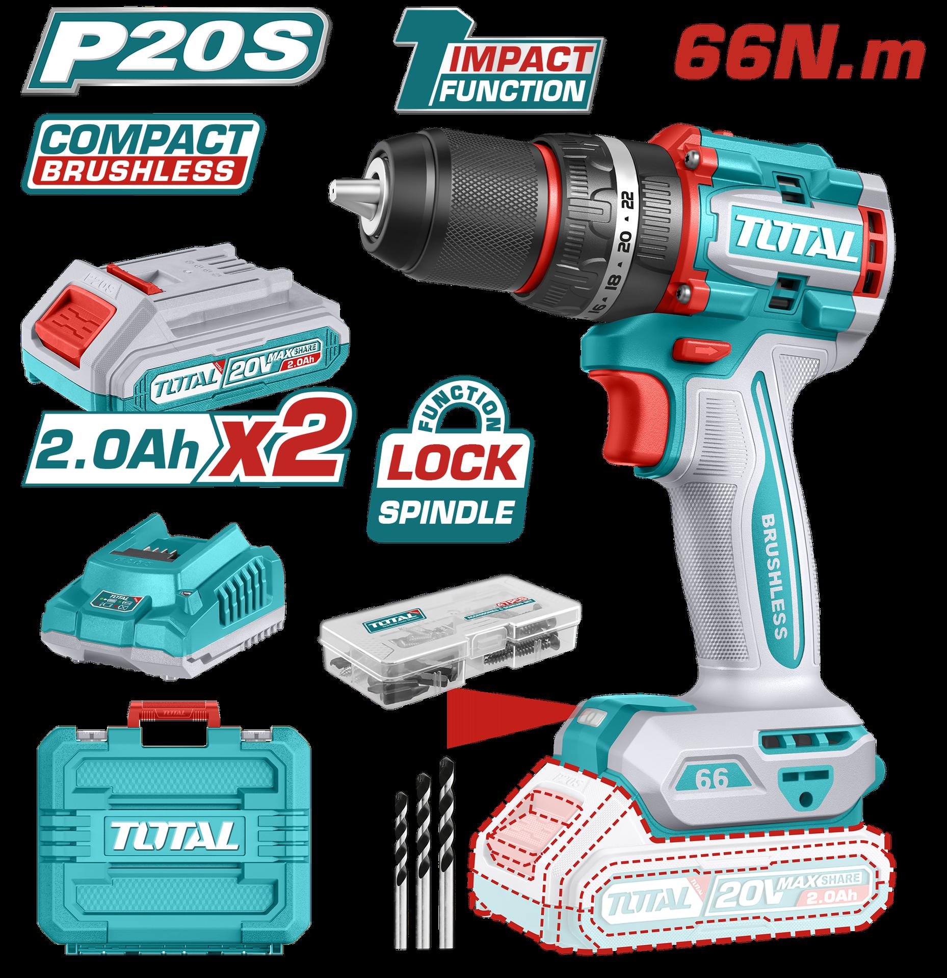 TALADRO INALAMBRICO PERCUTOR 1/2" 66N.M 20V CAJA PLASTICA INCLUYE 2 BATERIAS 20V, 1 CARGADOR Y ACCESORIOS INDUSTRIAL SUPER TOTAL (UTIDLI20668)