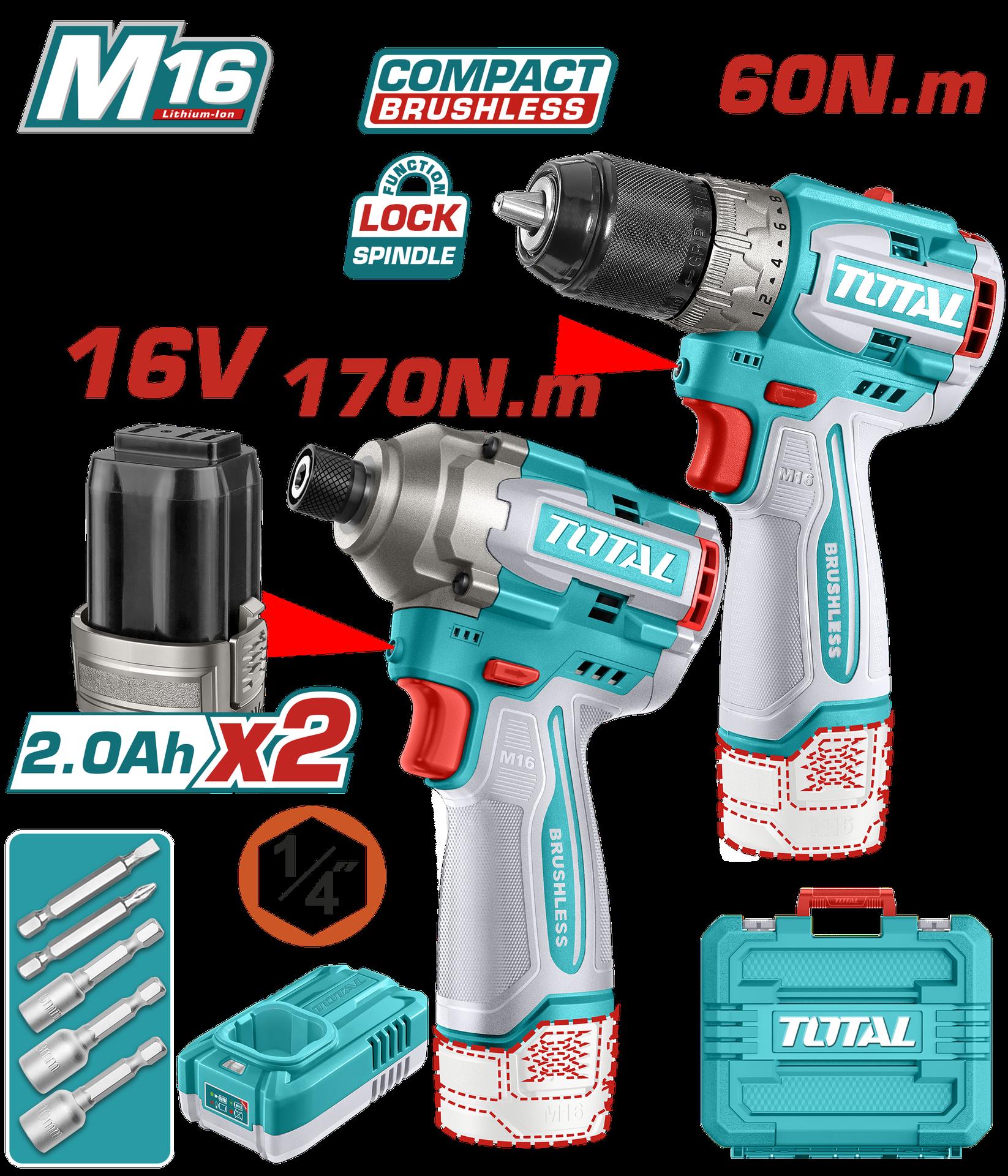 COMBO INALAMBRICO 16V TALADRO 1/2" 60NM + PISTOLA IMPACTO 170NM INCLUYE 2 BATERIAS, 1 CARGADOR COPA TORNILLO INDUSTRIAL SUPER TOTAL (UTOSLI240968)
