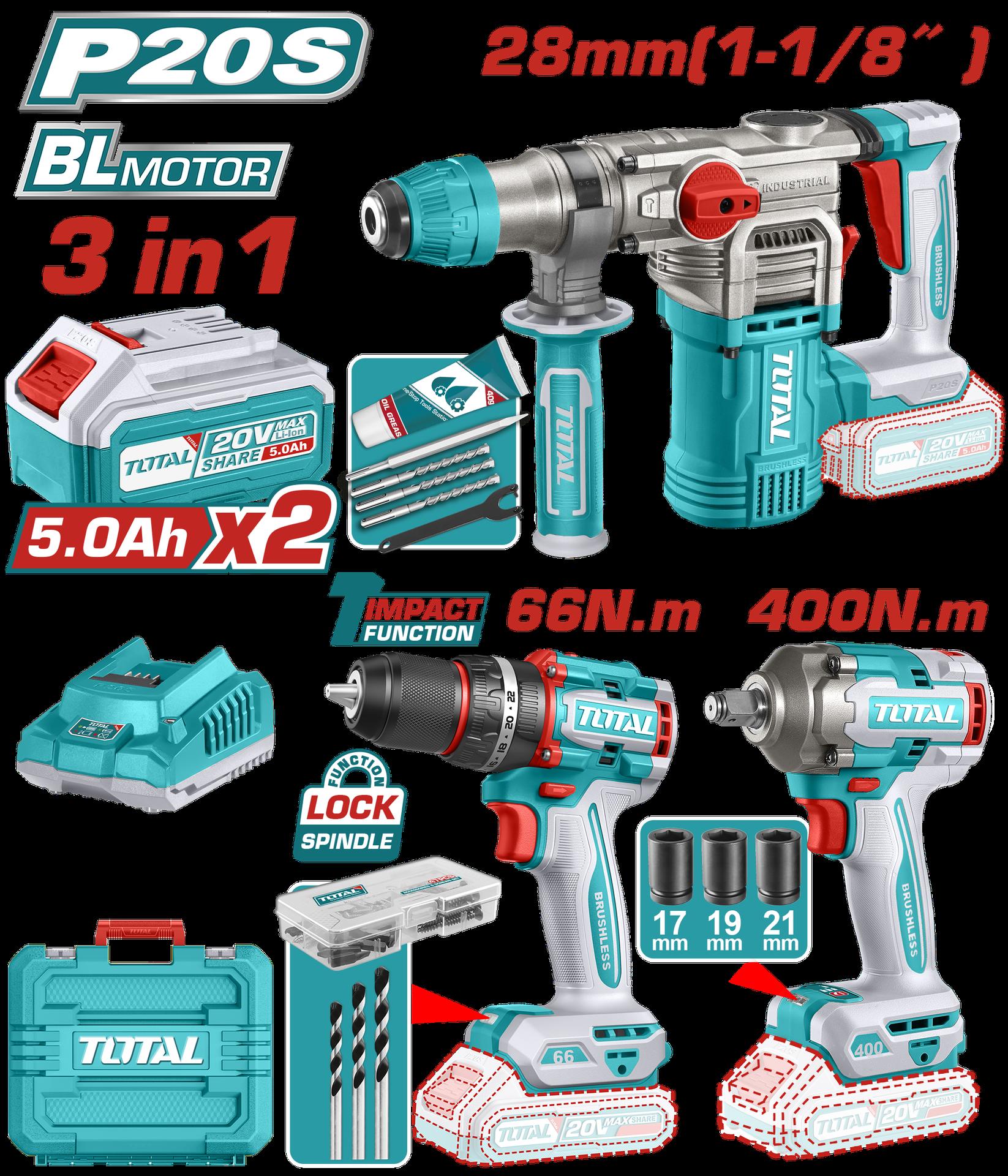 COMBO INALAMBRICO 20V TALADRO ATORNILLADOR 1/2" 66 N.M + PISTOLA DE IMPACTO 1/2" 400 N.M + TALADRO ROTOMARTILLO SDS PLUS 4.5 JULES INCLUYE 2 BATERIA 5.0AH , 1 CARGADOR Y ACCESORIOS INDUSTRIAL SUPER TOTAL (UTCKLI20638)