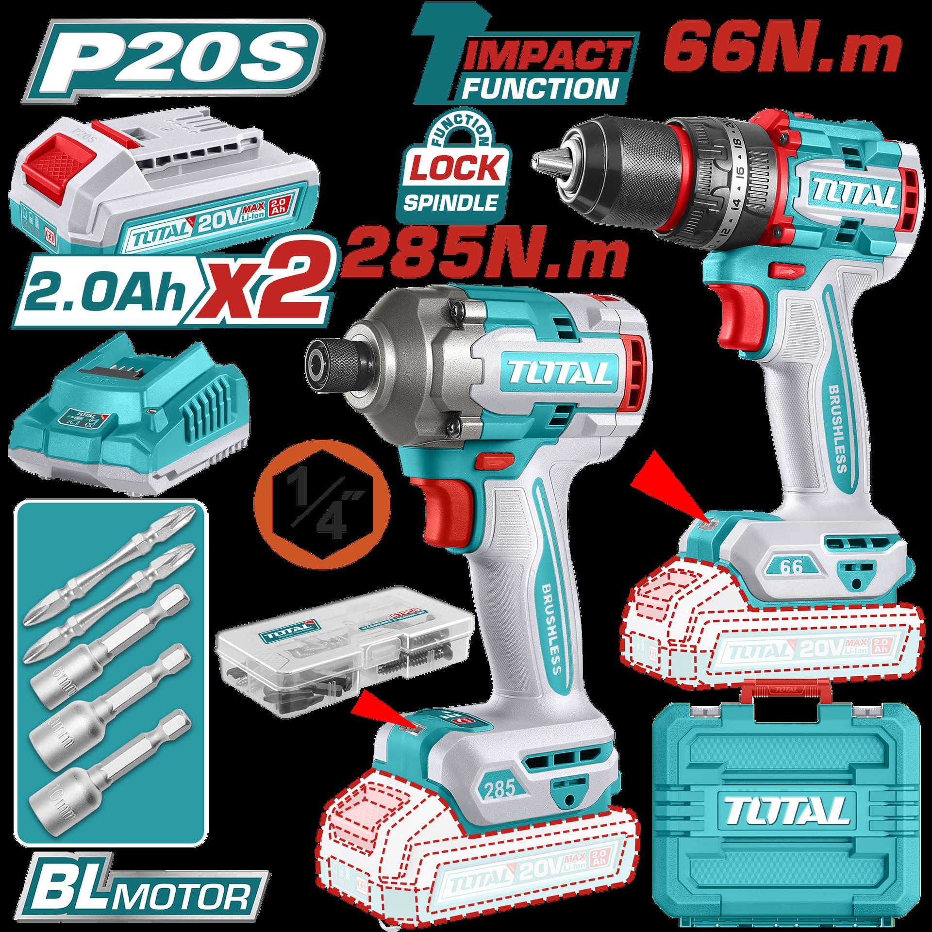COMBO INALAMBRICO TALADRO 1/2" 66 N.M + ATORNILLADOR DE IMPACTO 1/4" 20V 285 N.M INCLUYE 2 BATERIA 2.0AH , 1 CARGADOR Y ACCESORIOS INDUSTRIAL SUPER TOTAL (UTCKLI20277)