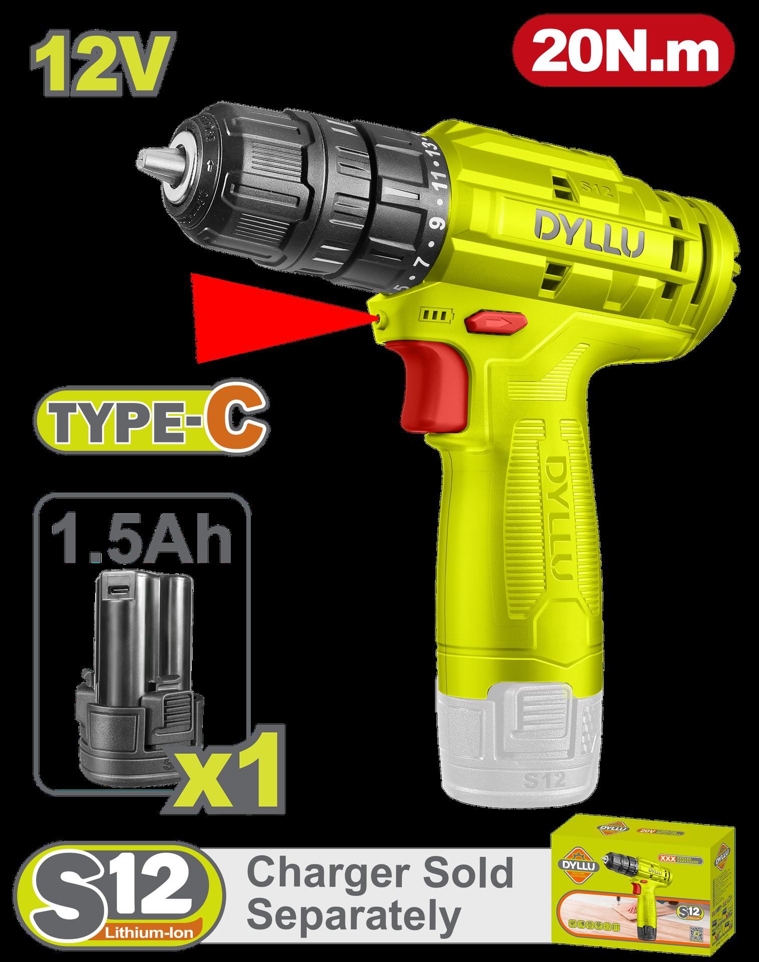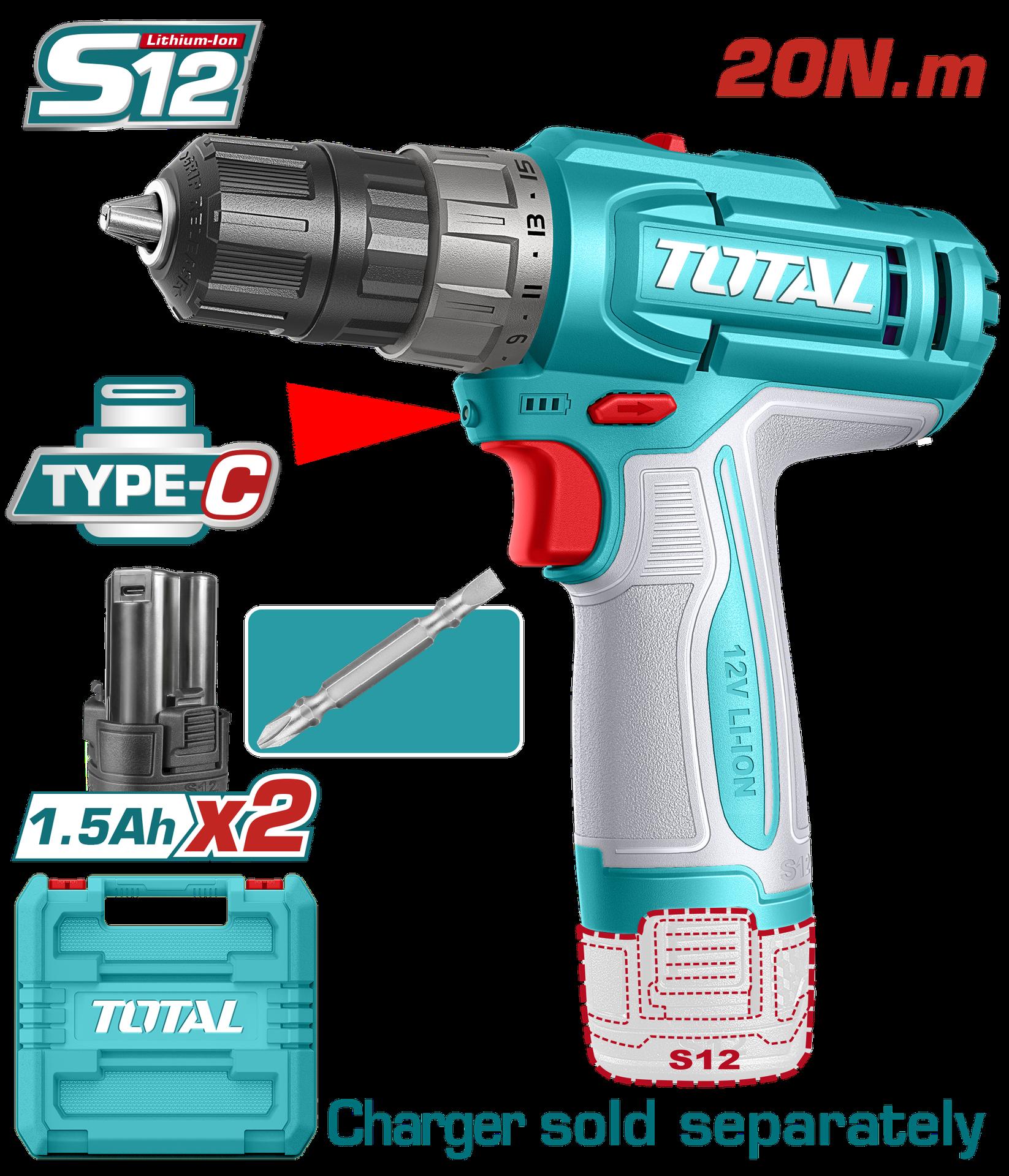 TALADRO INALAMBRICO 3/8 12V 20NM INCLUYE 1 BATERIA 1.5AH CARGADOR NO INCLUIDO TOTAL (DTCDS510)