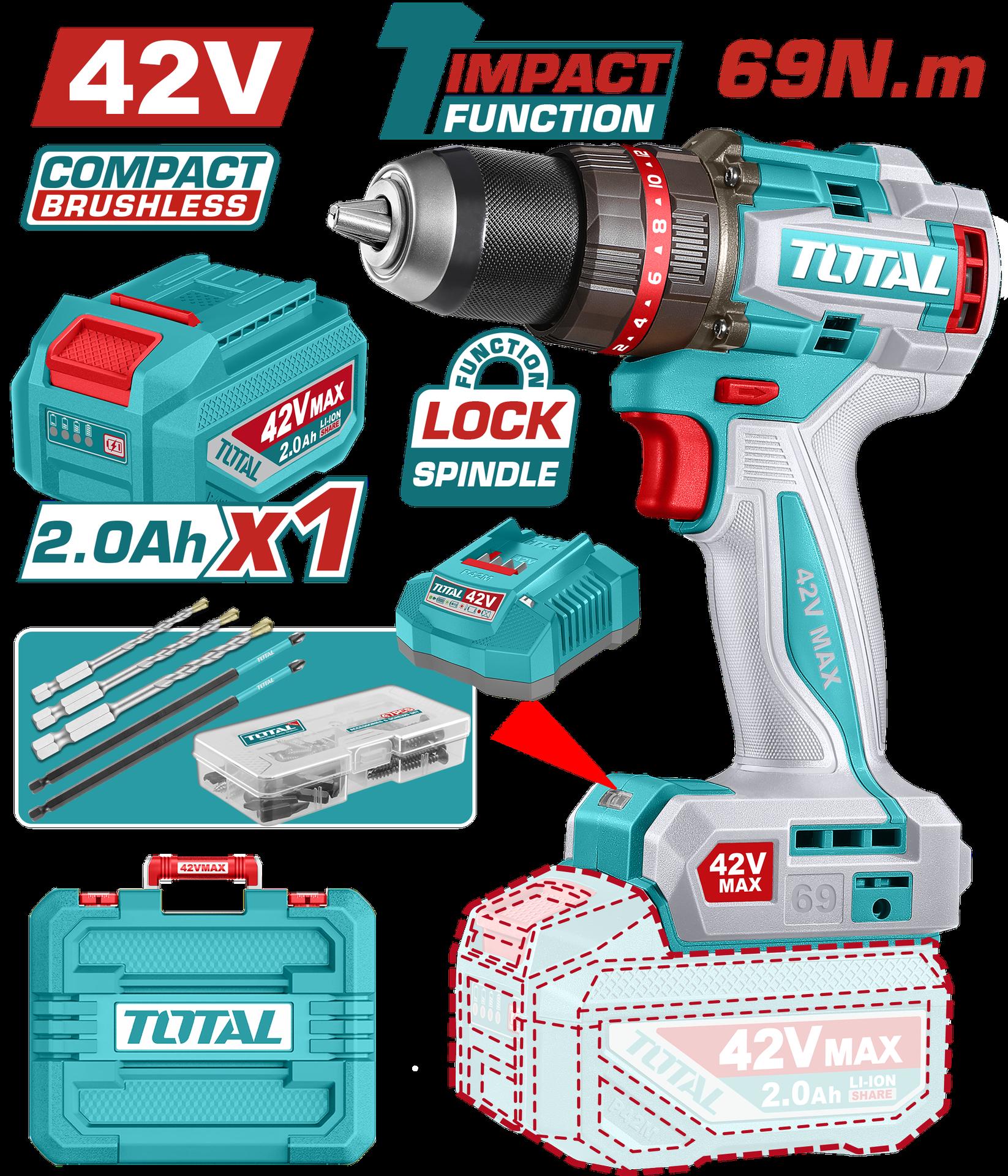 TALADRO PERCUTOR ATORNILLADOR INALAMBRICO 1/2 20V 66 NM BATERIA Y CARGADOR SE VENDEN POR SEPARADO, INCLUYE 4 ACCESORIOS INDUSTRIAL SUPER TOTAL (TIDLI206681)