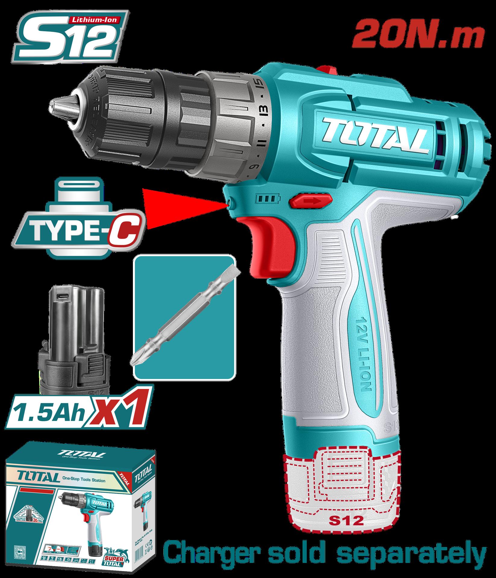 TALADRO INALAMBRICO 3/8 (10MM) 20NM 12V INCLUYE 1 BATERIA DE 1.5AH CARGADOR TIPO-C NO INCLUIDO SUPER TOTAL (TDLI122061)