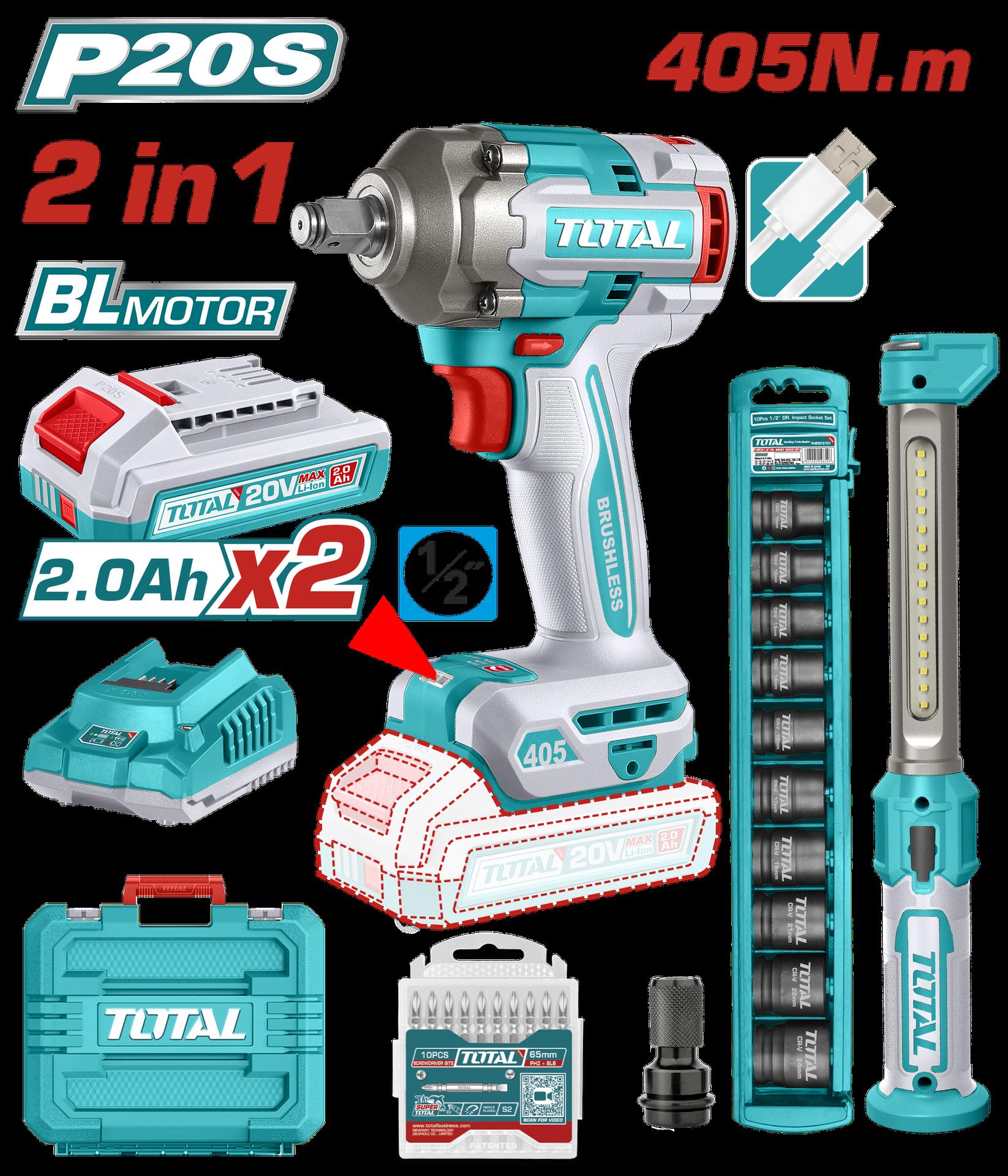 COMBO INALAMBRICO 20V PISTOLA IMPACTO INALAMBRICO 1/2 405 NM + LÁMPARA DE TRABAJO 300 LUMENES RECARGABLE + 10 COPAS 1/2 (10-24MM)+ ADAPTADOR DE 1/2 A 1/4 + 2 BATERIA 2.0 AH + ACCESORIOS Y
