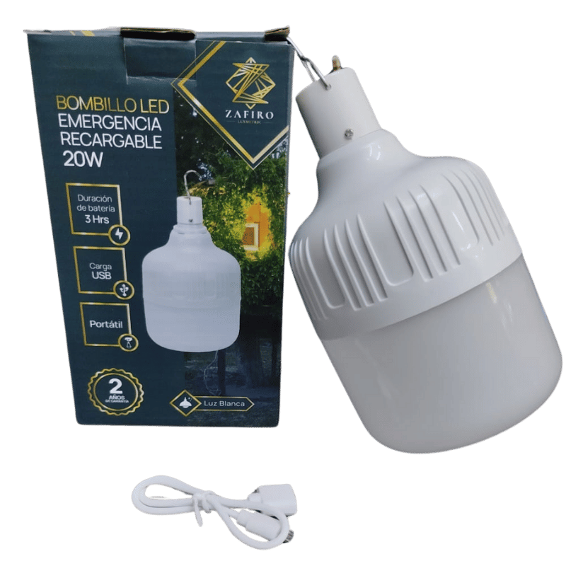 BOMBILLO LED EMERGENCIAA ZAFIRO RECARGABLE USB 30W 6500K CON GANCHO